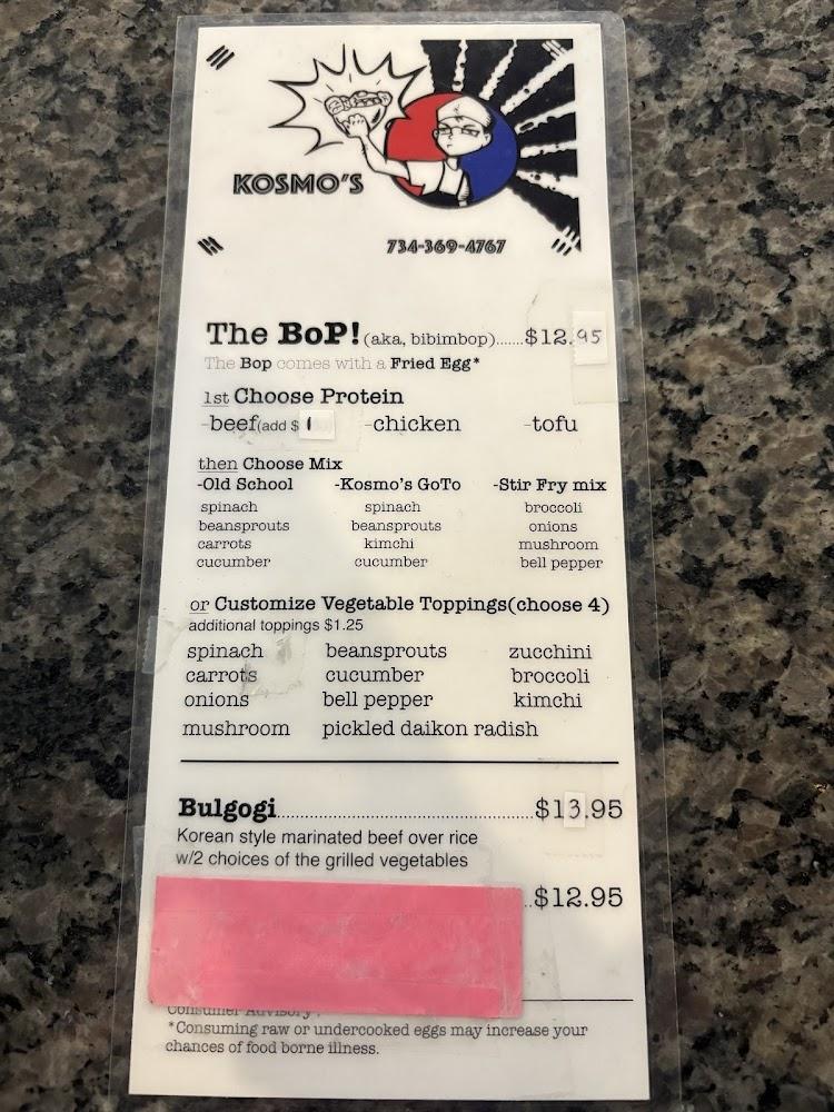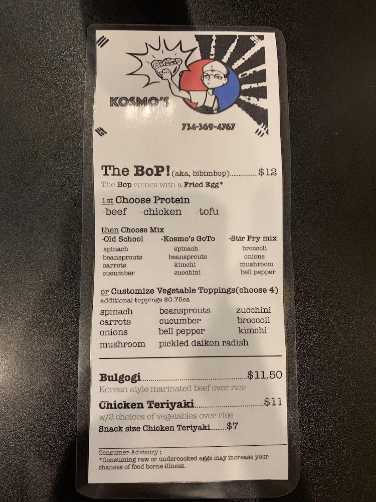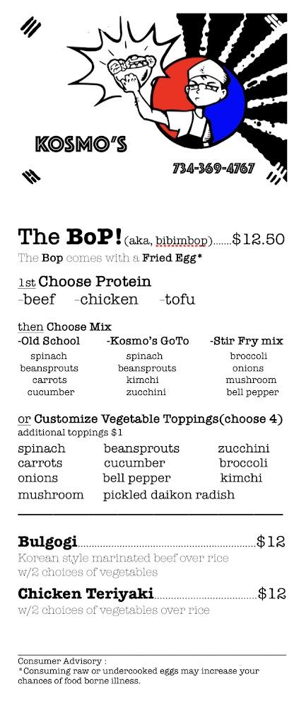 Welcome to Kosmo's BopShop, where culinary creativity meets a cozy street food vibe. Established in 2001 in Kerrytown Market, our unique dining experience has evolved into a delightful destination on South Ashley. Specializing in create-your-own Bibimbop, we cater to all palates with vegetarian options and simple, healthy fare. Enjoy a relaxed atmosphere perfect for solo dining or group gatherings, with accessible facilities for everyone. Whether you’re stopping by for a quick lunch, dinner, or takeout, Kosmo's BopShop promises a deliciously satisfying experience that keeps you coming back for more. Come taste the difference!